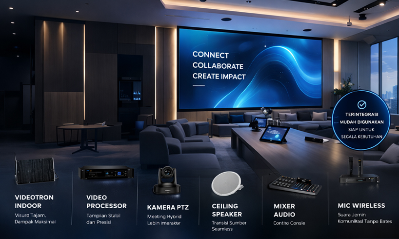 Integrasi Digital Code merancang solusi menyeluruh dengan menggabungkan Videotron Indoor sebagai display utama, didukung Video Processor untuk pengolahan visual yang stabil dan presisi. Sistem dilengkapi Kamera PTZ untuk kebutuhan hybrid meeting, serta Video Switcher yang memungkinkan perpindahan sumber secara seamless. Dari sisi audio, digunakan Ceiling Speaker, Mixer Audio, dan Mic Wireless untuk memastikan distribusi suara merata, jernih, dan profesional di seluruh ruangan.