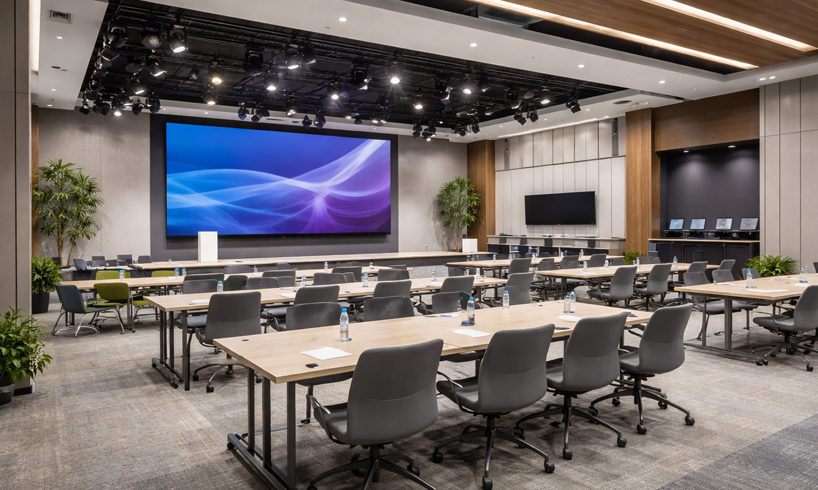Ruang serbaguna modern harus mendukung hybrid meeting, yaitu menggabungkan audiens offline dan online.